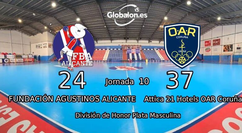 El pabellón del Colegio San Agustín fue testigo este domingo de una de esas derrotas que duelen más por cómo se producen que por el marcador en sí. El Fundación Agustinos Alicante, líder hasta la fecha en la División de Honor Plata Masculina, cayó claramente ante el Attica 21 Hotels OAR Coruña por un contundente 24-37, en un partido que desde el minuto 10 ya tenía dueño.