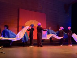 En la obra participaron escolares de entre 3 y 17 años, que cantaron, bailaron, interpretaron escenas teatrales y tocaron instrumentos para recrear sonidos de la naturaleza como el agua del río, la lluvia o el viento. La función incluso se desarrolló entre las butacas del auditorio, logrando una experiencia inmersiva que cautivó a los asistentes. También colaboraron varias madres y padres durante la representación.