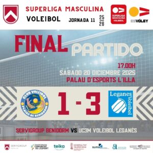 El Palau d’Esports l’Illa esperaba una fiesta y terminó con un jarro de agua fría. El Servigroup Benidorm soñaba con cerrar la primera vuelta con premio, pero el UC3M Voleibol Leganés impuso su ley en la red y se llevó un triunfo que deja a los alicantinos mirando hacia abajo. El marcador (1-3) refleja lo que se vio en la pista: un rival más contundente en bloqueo, más regular en defensa y con un saque que hizo daño cuando más quemaba el balón.