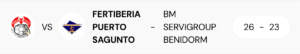 Fertiberia BM Puerto Sagunto (26): Juani Villarreal, Marcos Castañeda, Olivares (3), Paco Ruiz, Dani Martínez, Pozzer (4), Arnau Fernández (3), Gonzalo (3), David García (2), Matheus de Novais (2), Macrino Pérez, Serradilla, Capitán (2), Zungri (3), Carlos Martín (4), Teixidor.