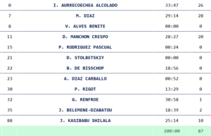 Renfroe (1), Manchón (20), Rigot (0), Aurrecoechea (26), Kasibabu (10) –quinteto–; Mateo Díaz (28), Alves (0), Rodríguez (0), Stolbetskiy (0), De Bisschop (0), Antonio Díaz (0), Belemene‑Dzabatou (2).