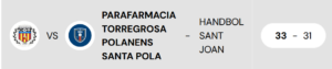 Resultado final ida: Parafarmacia Torregrosa Polanens Santa Pola 33 – Handbol Sant Joan 31
