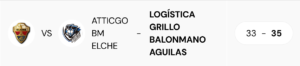 El pabellón Esperanza Lag vio un partido de los que dejan huella aunque el resultado no acompañe. El Atticgo BM Elche cayó por 33-35 frente al Logística Grillo BM Águilas en un encuentro con dos relatos: uno que parecía escrito por la autoridad visitante y otro que, de repente, se convirtió en una carrera contra el tiempo con el público empujando y el equipo franjiverde jugando al límite.